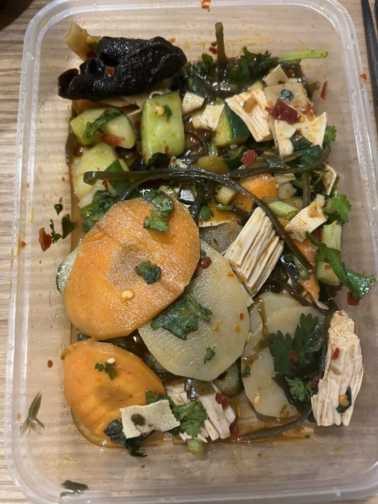 右端のマンゴーサラダとパパイヤサラダは割と辛いので気をつけてください。春雨サラダはセロリが美味しいです。